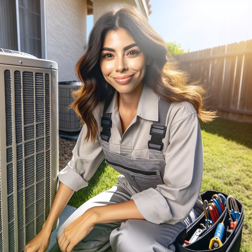 A certified HVAC technician working on an air conditioning unit in a residential setting, showcasing tools and equipment